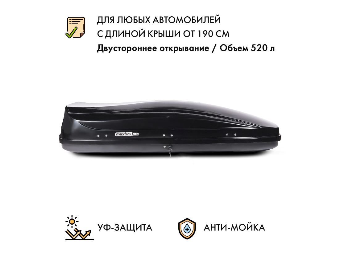 Автобокс MaxBox PRO 520 (большой) черный глянцевый (металлик) 196*80*43 см двустороннее открывание (багажный бокс на крышу)